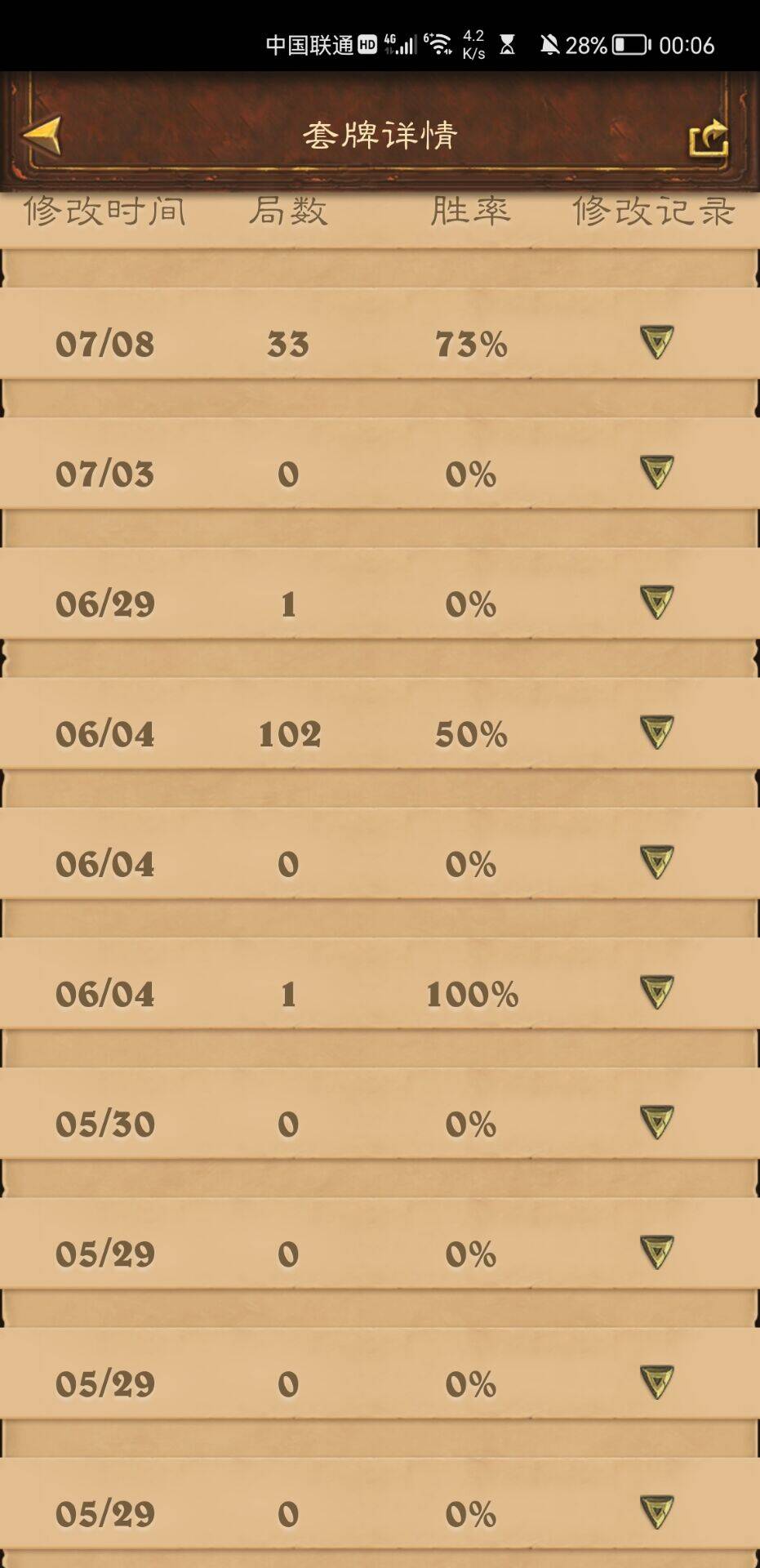 *以上对局均基于传说前2000环境。其中6月4日后的102把环境中有较多的窃贼术以及抓窃贼术的奥秘法,环境相对一般,并且此时安娜科德拉与超凡之盟光环覆盖有bug,仅维持50%的胜率。7月8号后的对局均为当前环境,加上其他账号的对局数据,补丁后此卡组胜率为70%。