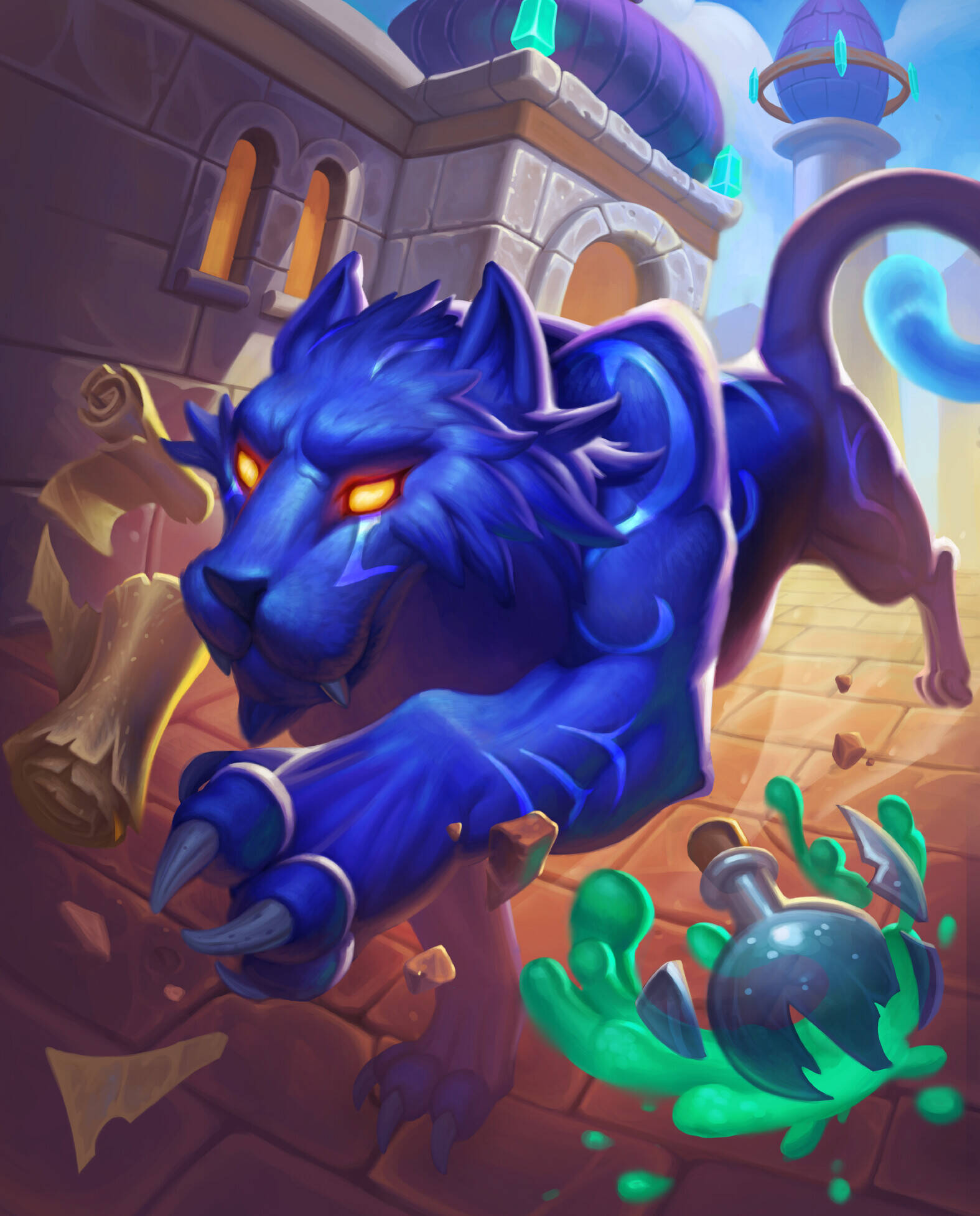 越早开超凡之盟我们的优势越大。在场面上有豹子的情况下,5费可以使用自然研习减少下一张法术的费用从而6费开超凡之盟;也可以萌芽分裂复制豹子6费时一只豹子先攻击开超凡之盟后另一只豹子提供额外水晶。