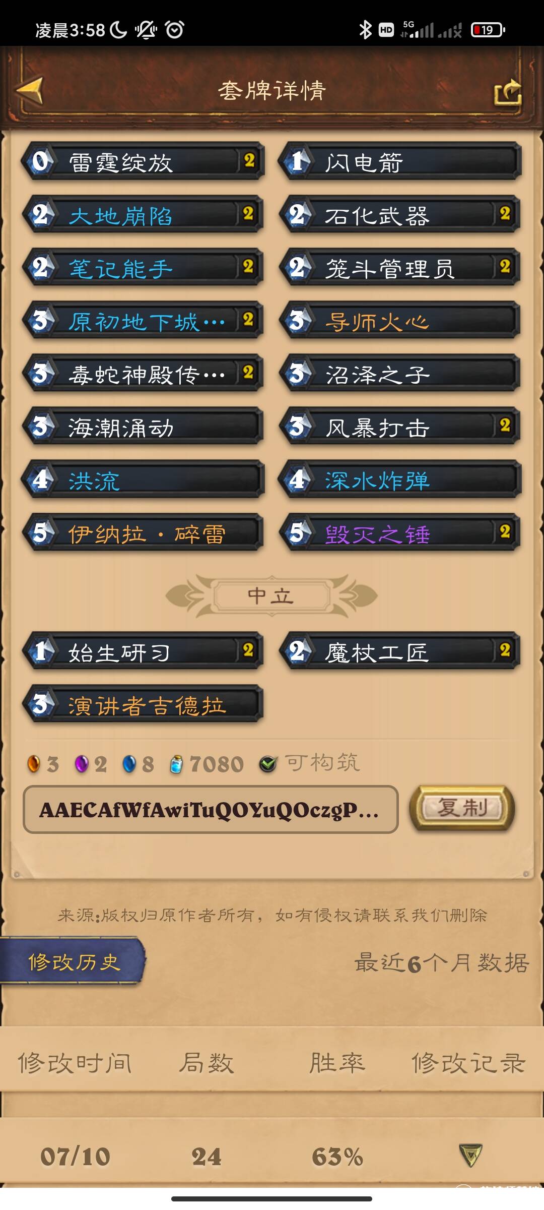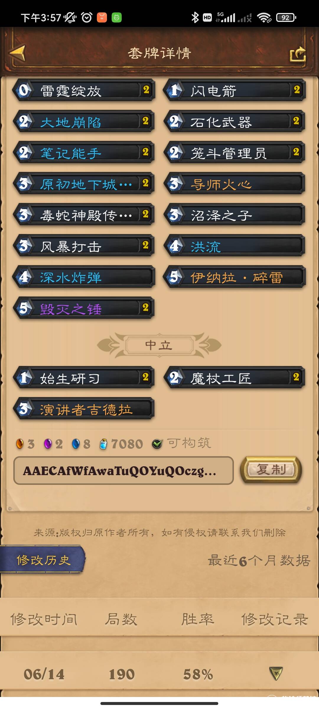 这篇攻略本来月初就想做了因为懒,因为元素打脸萨和t7猎出场率越来越高,我的总胜率从上个月的60掉到了现在的58,t7猎还算可以应对,元素打脸萨一旦胡了实在难以招架。好在我把一张闪电箭换成海潮涌动后,打回到了原先的排名,让我感觉这个思路在当前环境还是有强度的,最后写出了这篇攻略。