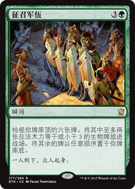 征召军伍把多个看似不相干的思路融合在一起,让套牌的运作更加顺滑。这套牌里一共有32个总法术力等于或小于3的生物,**稳定了征召军伍的收益。更重要的是,它能在瞬间时机翻出我们的组合技组件和终结手段,让对手更难应对!