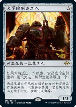 为了让套牌的运作更加顺滑,我们还加入了一些生物。金鹅、不倦追迹人和瑟班巡检官本身身材合格,在这套牌里也有着优异的表现。当隐匿动物学家罗尼斯和大学院制造工人同时在场时,金鹅和瑟班巡检官都相当于附带四个神器的急迫祭礼,让我们可以在一回合里施放大量咒语并迅速过牌。同时,他们还降低了这套牌对罗尼斯的依赖性,只有大学院制造工人在场时也能打出不错的展开。不倦追迹人进场并没有任何效果,但会随着对局的进行持续发力,也让我们的找地地有了额外收益。