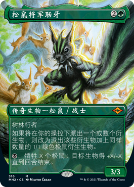 松鼠将军聒牙十分契合这套牌的衍生物思路,在我们制造衍生神器的同时展开场面,帮助我们更好应对对手的攻势,为组合技争取时间。其次,它还是一个可重复利用的去除,我们也能用征召军伍把它翻出来。总的来说,松鼠将军聒牙并非构筑的核心,而是一张帮助我们拖延时间的单卡。