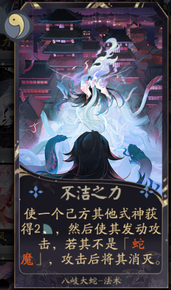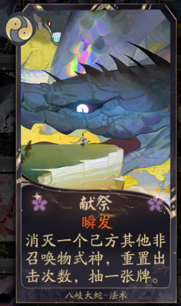 献祭:非常灵活的一张牌,能用做重置出击产生蛇魔或消灭蛇魔。分别说下重置出击和产生蛇魔一般需要提升伤害时使用,配合神念之影不洁之力一回合可以打出高额伤害,消灭蛇魔则是我们需要使用相关式神牌时先消灭后立刻使用桃花或犬神复活进行的操作。