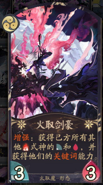 火取剑豪:我们另一个获胜点,当我们前期优势巨大时可以3勾第一回合打出配合巨大身材拿下对局,或后期配合大蛇觉醒使用,吸收大蛇觉醒和蛇魔的巨额身材来压倒对手,另外不管配合前期蛇魔或后期大蛇觉醒都可以白嫖一个迅捷,只需要我们在启动的回合留下一个迅捷的蛇魔即可。