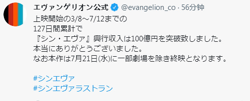 EVA官推宣布,《新·福音战士剧场版:终》票房于突破了100亿日元大关,电影自公布后多次延期,终于在今年3月8日登陆日本院线,到7月12日,花了127天达成百亿票房。
