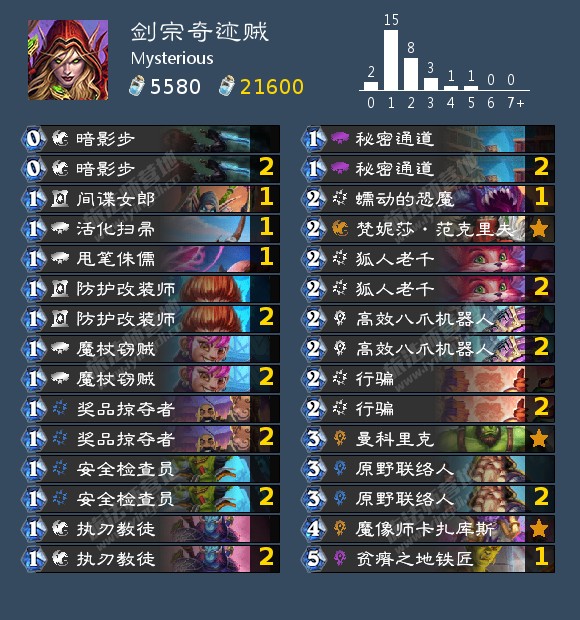 总的来讲,整个天梯的盗贼都仰仗着以联络人为核心的刷牌体系,近期新兴的节奏贼也是一个非常针对环境,优秀且完整的体系,在对局方面也有诸多细节可以考量。我要说的是,盗贼这个版本的各类卡组都是万变不离其宗,用一个字概括就是:编。在每个拥有大量空余费用和未知手牌(比如联络人,通道)的回合都要预先想好自己想要什么,如果来了怎么打能站场解场最大化,如果没来又要怎么解决手头的困境。如果能够在每个抉择点都提前做好以上的考量(最好随着对手的每个操作进行思考),那么不管是红龙贼还是奇迹贼都是获胜思路简单明了而且操作不困难的卡组。