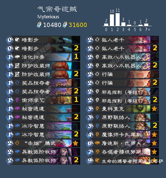 第一套气宗奇迹贼的最显著改动就是对魔杖窃贼这张卡的放弃。首先我在这里列举一下法师这个版本的法术池以及和气宗奇迹贼的配合度:冰风暴(一般),冰冷智慧(极高),始生研习(略高),急速冷冻(一般),能量之泉(一般),衰变飞弹(极高),迸射流星(高),制造法力饼干(低),咒术洪流(极低),唤醒(快攻,节奏卡组低/控制卡组一般),符文宝珠(极高),考前刷夜(低),野火(零),冰爆冲击(近似于零),冰锥术(一般),奥术智慧(一般),寒冰护体(低),绿洲盟军(一般),法术反制(低),镜像实体(低),燃烧(略高),虚空之风传送门(略高),套圈圈(低),非公平游戏(对牧师高,对其他职业几乎为0),愚人套牌(零),幻觉药水(特定情况奇效,其他情况低),火球术(极高),埃匹希斯冲击(一般),清凉的泉水(低),克苏恩面具(高),烈焰风暴(特定对居高,其余一般),华丽谢幕(几乎为零),深度冻结(低)