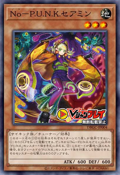 ①:支付600基本分才能发动。从卡组把「No-P.U.N.K.セアミン」以外的1只「P.U.N.K.」怪兽加入手卡。