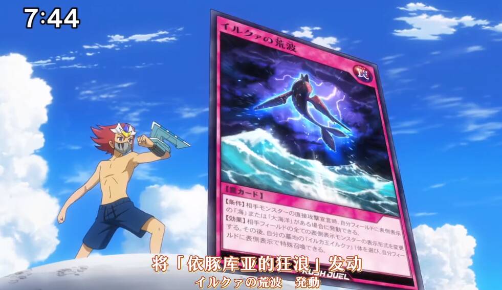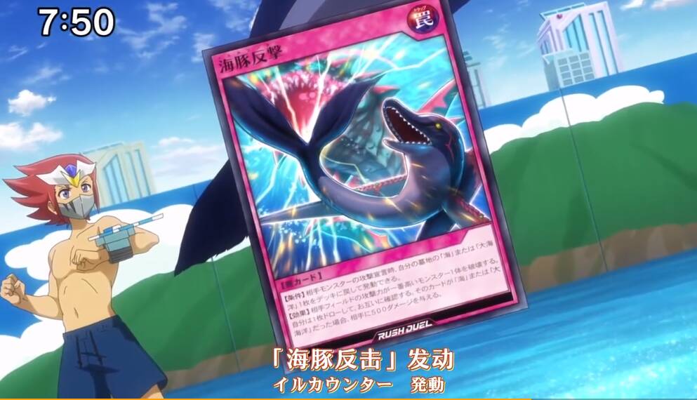 下级直接攻击时中了陷阱依豚库亚的狂狼,自己场上有海或大海洋时被直击才能发动,把对手攻表怪兽变防,然后苏生墓地的海豚王。