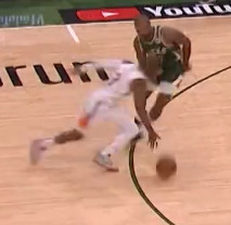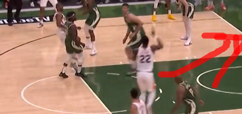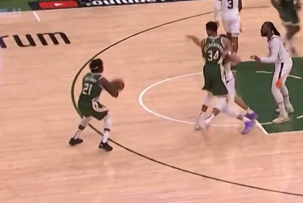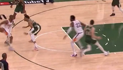 1 字母哥与外线球员(特别是霍乐迪与米德尔顿)的挡拆配合,字母哥利用自身无与伦比的冲框威慑力给队友创造投篮空间和太阳两个防守挡拆的球员面对两个单位且动态的体型碾压站位防守极度难以兼顾使得让字母哥有空缺走到空切深位(太阳不换防);