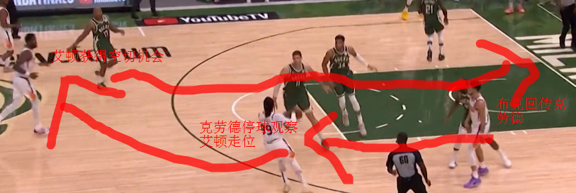 1 利用球员良好的战术执行力以及良好的落位习惯,在停球重新开球或者某些阵地转换的时候(包括雄鹿进球与否)打出一些简单的小战术拿分,比如太阳后卫运球利用艾顿在攻守球员之间位置的提前落位进行卡位拉出空间进行投篮等等