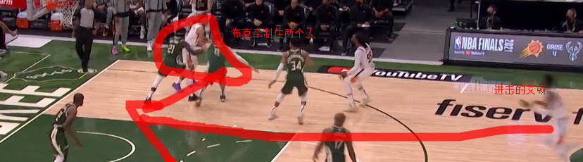 太阳换防的时候,雄鹿外线球员获得大打小机会,这个时候太阳球员肯定会为换防球员提供协防服务,而其他雄鹿球员利用盯防自己的人注意力不集中走到太阳无法兼顾的篮下接球空位上篮