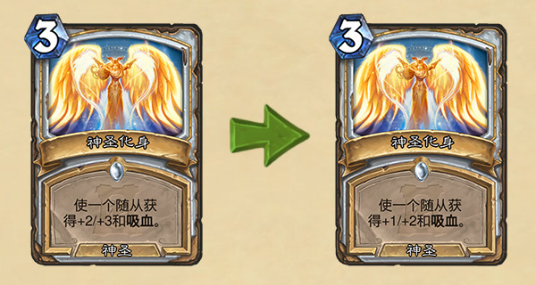 开发者评论:我们会对牧师进行两项改动,主要针对该职业的爆发治疗能力和资源生成能力。先说神圣化身吧——我们会将增益效果削弱为+1/+2,以控制卡牌的综合强度【本身的强度,general power】与配合性。治疗始终是牧师的强项,但我们希望减少玩家在应对牧师随从时的紧迫感。由于神圣化身可能构成的威胁,你现在似乎不得不解决牧师的每一个随从。稍微削弱增益效果,就能减轻这种紧迫感,也能使获得神圣化身增益的随从更好对付。这一削弱同时考虑到了萨穆罗与神圣化身的配合。目前而言,大量随从铺场的打法在遭遇这一配合时的后果过于严重。虽然我们希望能维持资源分配的紧张性【铺场投资的风险性,tension of resource commitment】,但我们也不希望铺场的后果是让对手恢复满血。削弱攻击力加成,能够将配合的强度维持在较为健康的范围内。