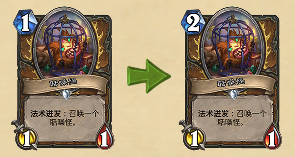 开发者评论:聒噪怪会改成消耗2点法力值。聒噪怪现在是许多“毫无游戏性”的对战的罪魁祸首,这些对战在前期就陷入了一边倒的局面,胜负总是过早地尘埃落定。我们希望减少这种情况发生的频率。将聒噪怪改为消耗2点法力值后,对手就更可能有能力应对前期的小怪威胁了【应对这个小家伙早早铺出的场面了,an early board of this little menace】。