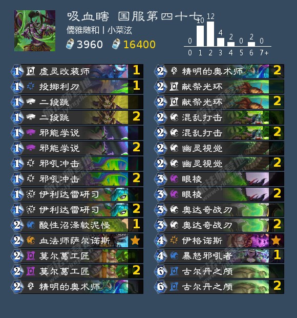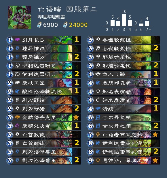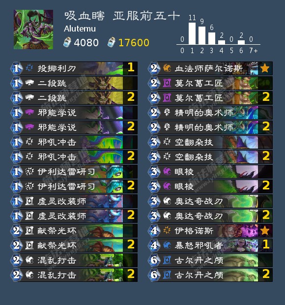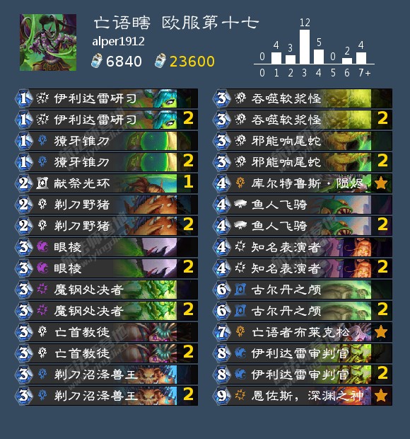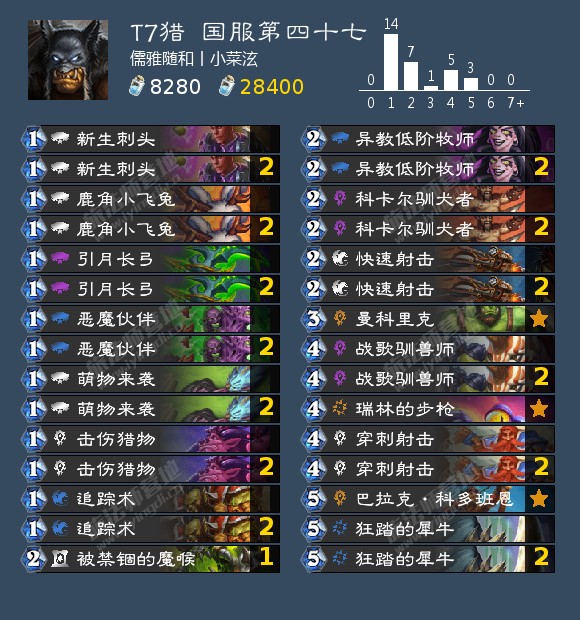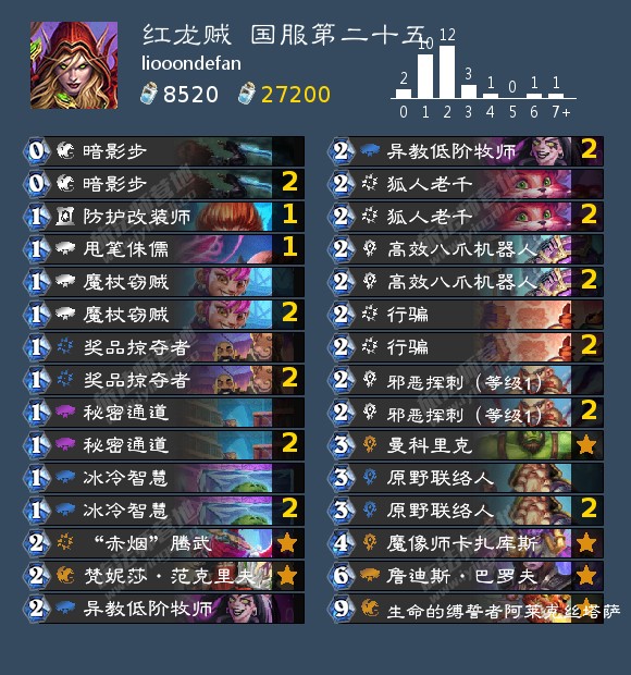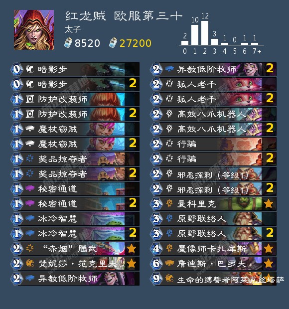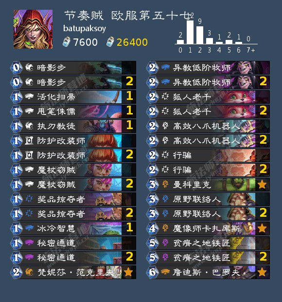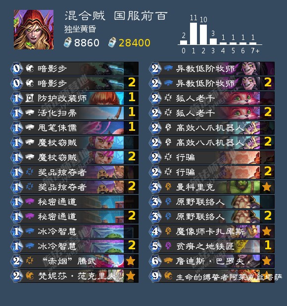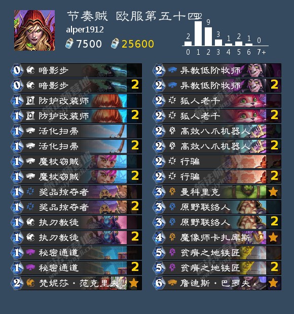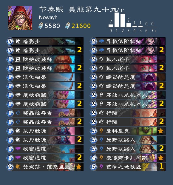 综合下来看还是挺不错的一个职业,对于使用者的操作相当有要求,当然,贼的版本地位也是建立在这版本优秀的底子上的,带上这些新卡的贼怎么组其实都差不太了,所以版本末期出现类似于节奏贼的构筑也并不意外。