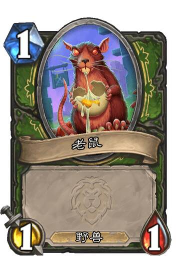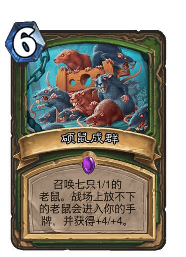 召唤七只1/1的老鼠。战场上放不下的老鼠会进入你的手牌,并获得+4/+4。