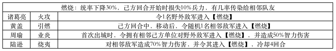 三国时期的赤壁之战应该没有人没听说过吧,火烧赤壁中的火攻,在三国字里,转化为了燃烧这一状态,处于燃烧状态时统率下降30%,己方回合开始时损失10%兵力,有几率传染给相邻队友。可以传染这一效果,如同火可以蔓延一般,很是生动形象。