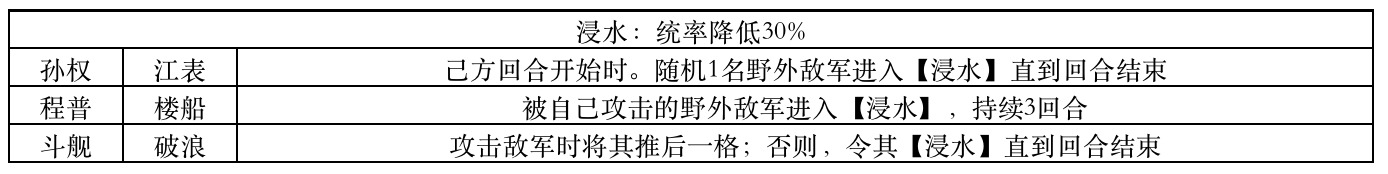 有火攻,自然就也有水淹,让敌方单位进入浸水状态,统率降低30%。