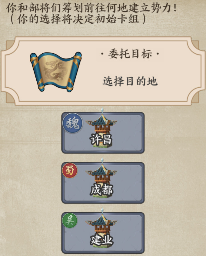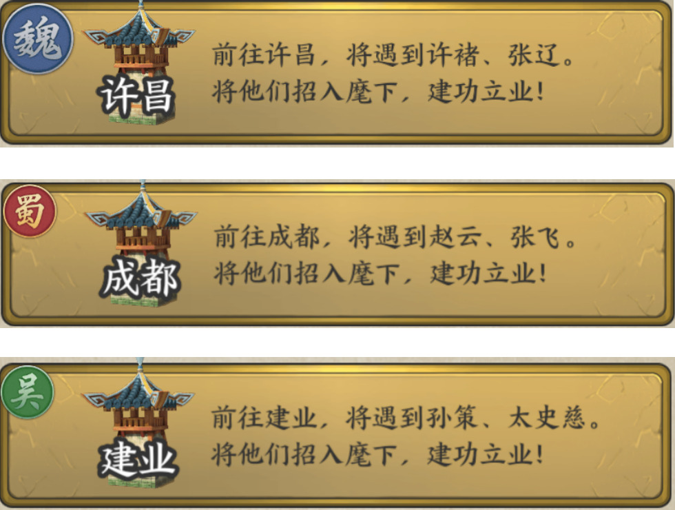 很快,就到了选择阵营的时候了,选择一个自己偏爱的阵营,可在接下来的新手关卡中获得该阵营的卡牌,组建自己的初始卡组。选择魏国,则前往许昌,将许诸和张辽收入麾下;选择蜀国,则前往成都,将赵云和张飞收入麾下;选择吴国,则前往建业,将孙策和太史慈收入麾下。(我也不知道为什么魏的标识会更大一些)
