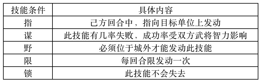 每张卡牌都有自己的技能,同时,若通过使用功勋进阶卡牌的职位,还可以获得额外的技能。很多技能的使用是有一定的条件的,在技能开头会标记有【指】【谋】【野】【限】。