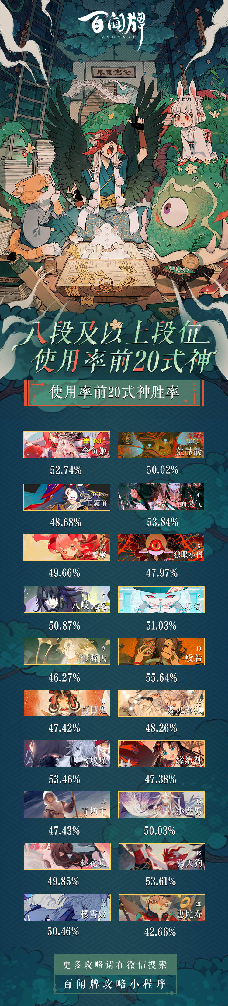 其中面灵气般若胜率位列前20式神中前二是非常优异的老式神大家可以多多使用。而后10位中新式神惠比寿爷爷直接垫底胜率也是前20中最低,看来是很有必要增强增强。