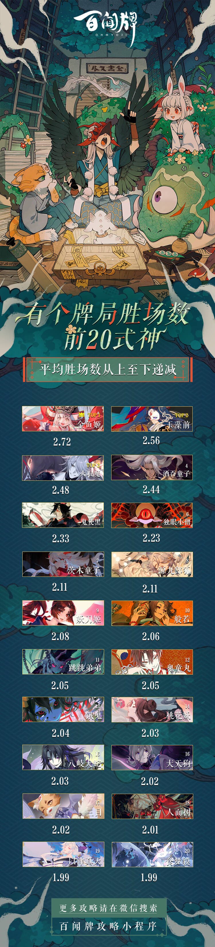 而老式神这边排名中剩下都是拥有强力单卡质量的式神或者能一己之力赢下对局的式神。大家牌局选择式神可以多多参考排名,会有助于提升牌局胜场。