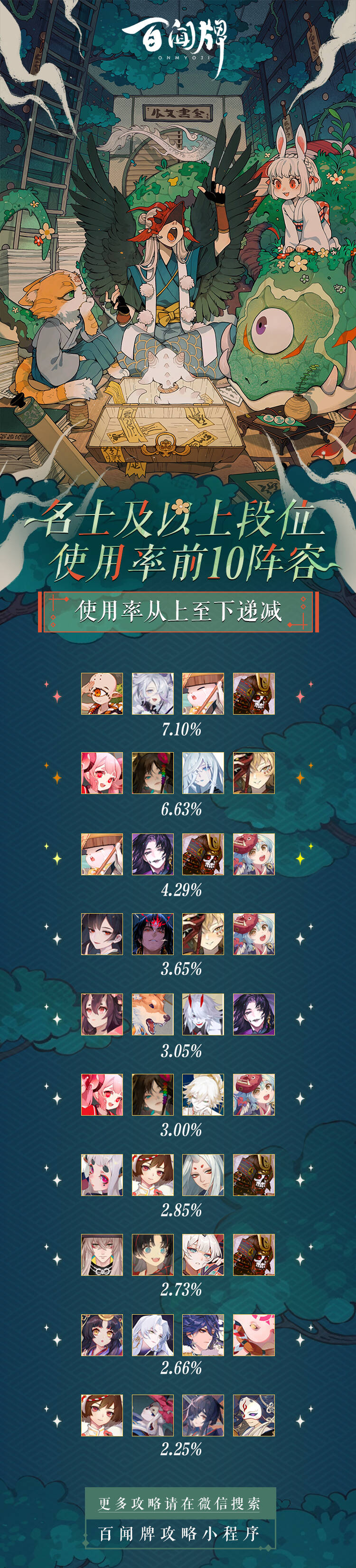 使用率前10卡组中花修金鱼、红莲大蛇、苍叶玉藻前等卡组,在小程序中均已收录详细的玩法攻略,其他未收录的主流卡组后续也会尽快补录对应详细攻略。