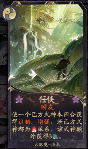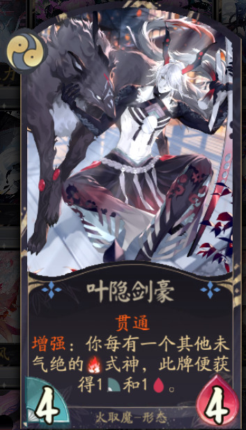 任侠:我们这套牌前中期唯一解牌,拿出来说的主要原因是:之前我们火取魔2勾节奏偏差所以打任侠当回合只能配合觉醒使用,而任侠配合迅捷蛇魔时就会剩下一点鬼火,这种时候剩下的一点鬼火,只能配合其他式神牌使用,但是我们携带叶隐剑豪后就能觉醒加形态然后任侠给蛇魔使用打满操作,这样就丰富我们2勾节奏。