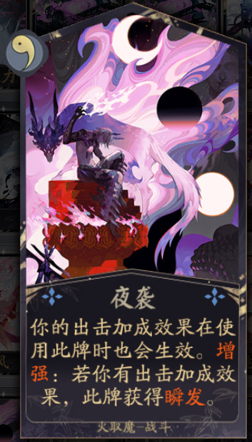 夜袭:单纯增加火取魔攻击频率的牌,一般开局除非我们手牌应有尽有时才会选择留下。瞬发的效果需要配合鼓舞才能使用,而我们这套中只有桃花的桃之夭夭能提供鼓舞,所以大家不需要太考验瞬发单纯就当增加叶隐剑豪攻击频率使用就好,当然我们手牌有桃之夭夭和夜袭同时在的情况,我们就可以配合不洁之力让叶隐剑豪一回合进攻3次,打出这个配合基本就已经完成斩杀了。