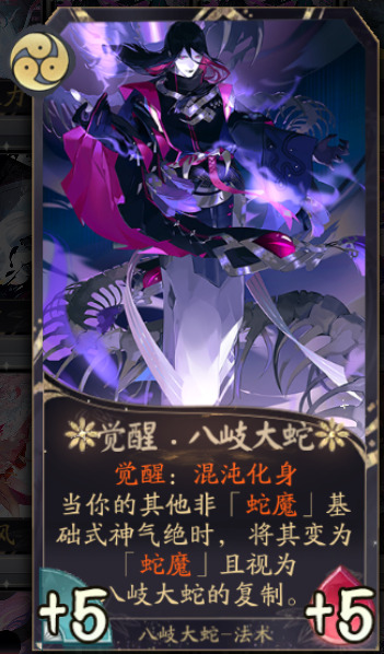 觉醒.八岐大蛇:我们唯一打后期的卡,觉醒后的大蛇每个蛇魔都具有化身能力,能让我们一回合触发多次化身形成觉醒大蛇的多重进攻。我个人认为后期最强化身就是大蛇了,只要我们成功大蛇启动,给一两个回合时间就能形成蛇魔大军,后续只要看大蛇表演就行了。