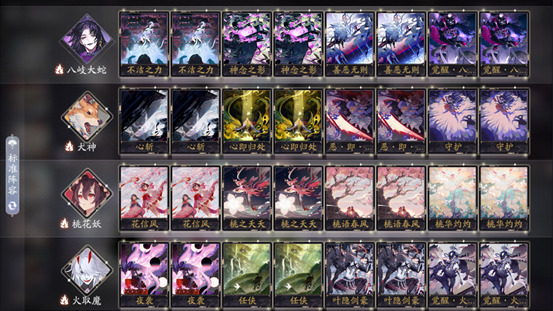 叶隐剑豪:我们这次的最大变化,叶隐剑豪是我们这套起手必留的关键牌,之前3勾火取剑豪速度偏慢,而叶隐剑豪增强我们2勾节奏,这样我们2勾就不只有犬神并且叶隐剑豪配合基础能力身材经常会9/9甚至10/10,我们配合蛇魔和叶隐剑豪轮番进攻2勾就能很容易的拿下战斗,这个带法提升了中期节奏让我们更快获胜,并且对后期依靠觉醒大蛇的赢法没有什么影响,甚至完美衔接中后期的节奏,非常推荐大家尝试。