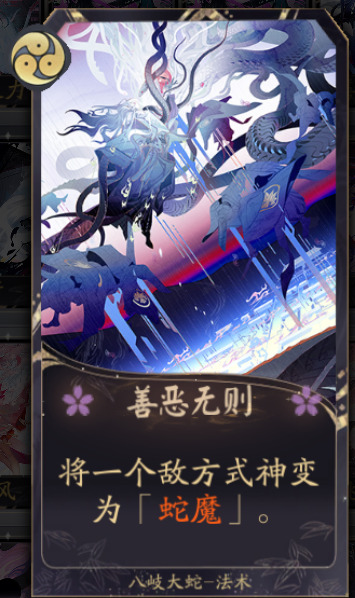 善恶无则:放弃献祭携带的3勾变形,我们经常3勾先善恶无则变化掉对面关键式神然后开启觉醒大蛇,这样就有充分的时间让我们觉醒大蛇发挥了,而且善恶无则后对方要送掉蛇魔才能进入复活倒计时,所以被我们变蛇的式神基本上4、5回合无法发挥作用。打如蟹姬之类后期式神善恶无则能让他们无法发挥,趁此机会我们持续进攻很快就能获得胜利,所以大家遇到后期阵容时我们可以选择起手留下封锁对方关键式神。