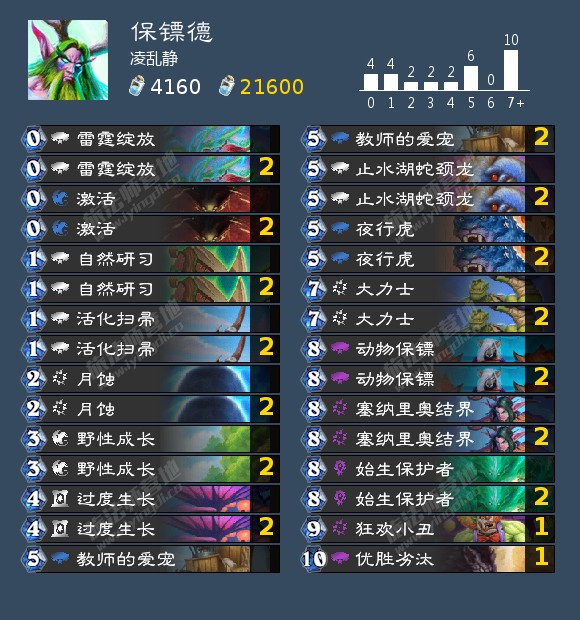 留牌思路:任何对局先后手都要留大小成长,以及绽放和激活(科技和伪科技),以及自然研习,如果同时有两张过度成长,在没有伪科技的情况下只留一张。动物保镖在有科技或者伪科技的时候都留,打节奏卡组要起手裸留,打吸血瞎先手可以不裸留(因为8费始生保护者在这个对局压制力的优先级更高,瞎场面上没有什么能出的生物),因此始生保护者在有任何科技的情况下打吸血瞎要裸留。月蚀打突袭战和猎人要留其余不留。值得注意的是打吸血瞎这个对局除了压死的赢法外还可以靠自然研习找超凡之盟,在瞎子开过头的合适回合打出。