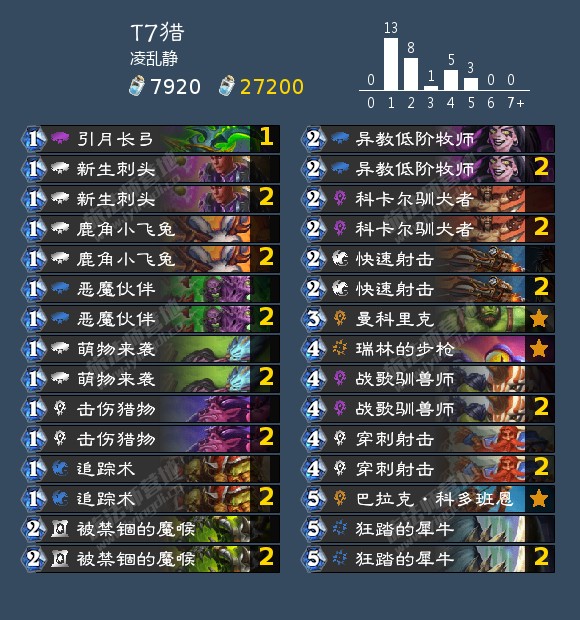 留牌思路:新生刺头、鹿角小飞兔、恶魔伙伴是必留牌,经常可以选择全留,一费拍生物,二费打出1+1的场面对于猎人来说也是不错的节奏。曼科里克是必留牌,因为猎人不仅带了535巴拉克·科多班恩还有两张追踪术,相当于除了自然神抽老婆外还可以靠另外3张牌在4、5费的时候很早把老婆拉出来。在所有对局中,快速出老婆不仅白站一个37身材的场面还能多打很多伤害,如果非要说T7猎的上限在哪里的话,曼科里克这张牌可以很好的诠释。起手有曼科里克的情况下选择留535巴拉克·科多班恩,否则不留。有一费生物节奏(六张牌)的情况下可以留萌物来袭。科卡尔驯犬者后手几乎必留,先手看情况留。被禁锢的魔喉多数情况下留,尤其是对阵法师、超生德这种对面前期没有什么场面兑换能力的卡组时非常关键,基本上能稳定输出10点伤害。但要注意这张牌在对阵同为节奏卡组的对手时是不一定留的,有时候2费你手里有魔喉,同时也有1+1的节奏,那就要考虑清楚到底打哪种了,因为有时候打1+1的节奏反而能多持续输出一轮伤害,魔喉也很可能撞到对手的生物上对场面帮助不大(因此不要总是惯性思维认为它是一张必留牌或者2费必出,惯性思维是打炉石甚至做任何事的大忌),总之中心思想就是尽量场面最大化和抢更多的血量。