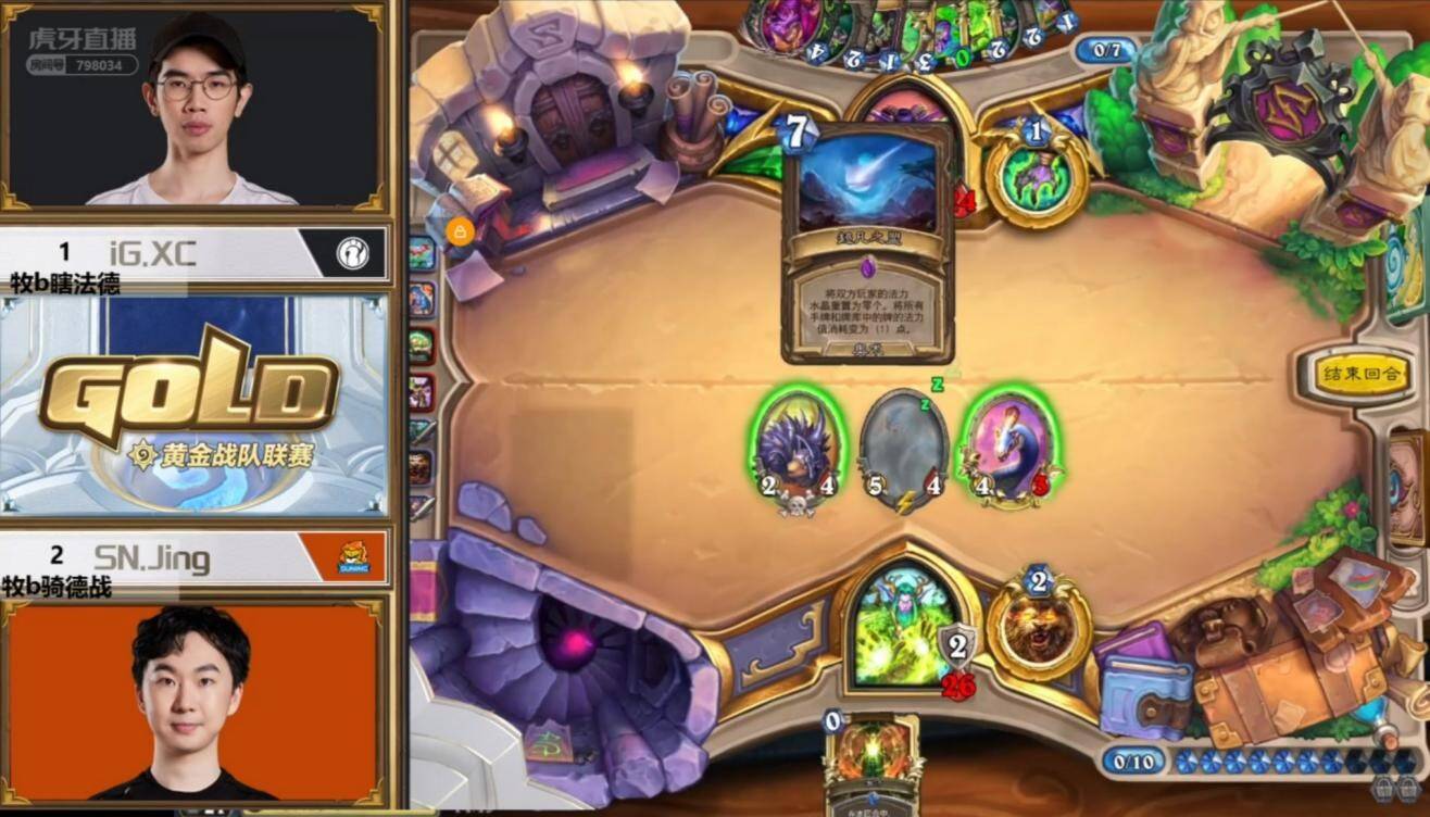 举例这场对阵IG贤菜的比赛,前中期德鲁伊没有抽到任何8费质量(6张牌),因此场面上给不了对手任何压制,吸血瞎比较顺利的解场过牌,在吸血瞎上回合开过头颅减费后打出超凡之盟劝退吸血瞎。