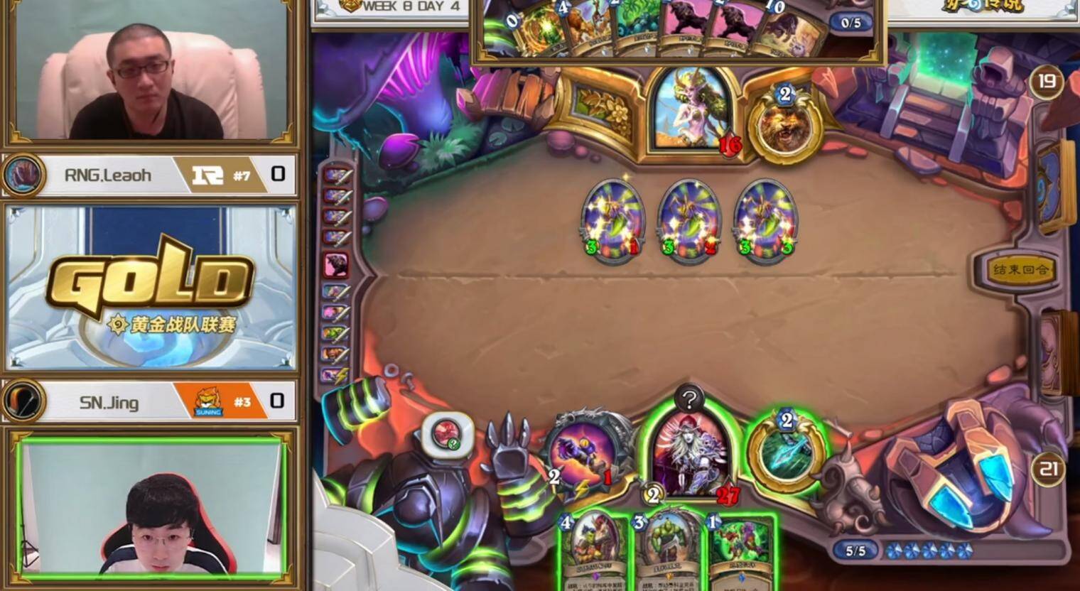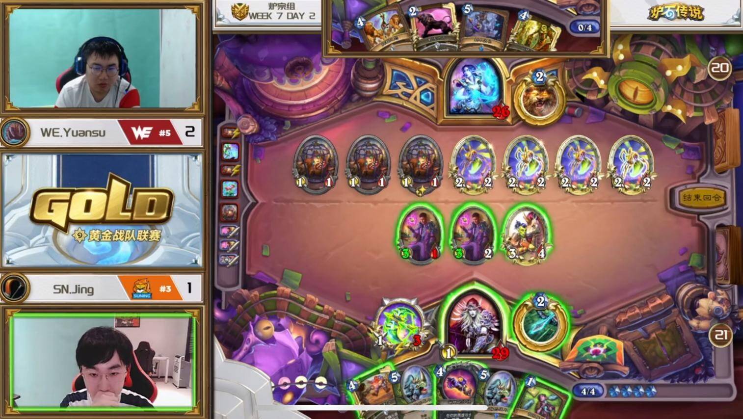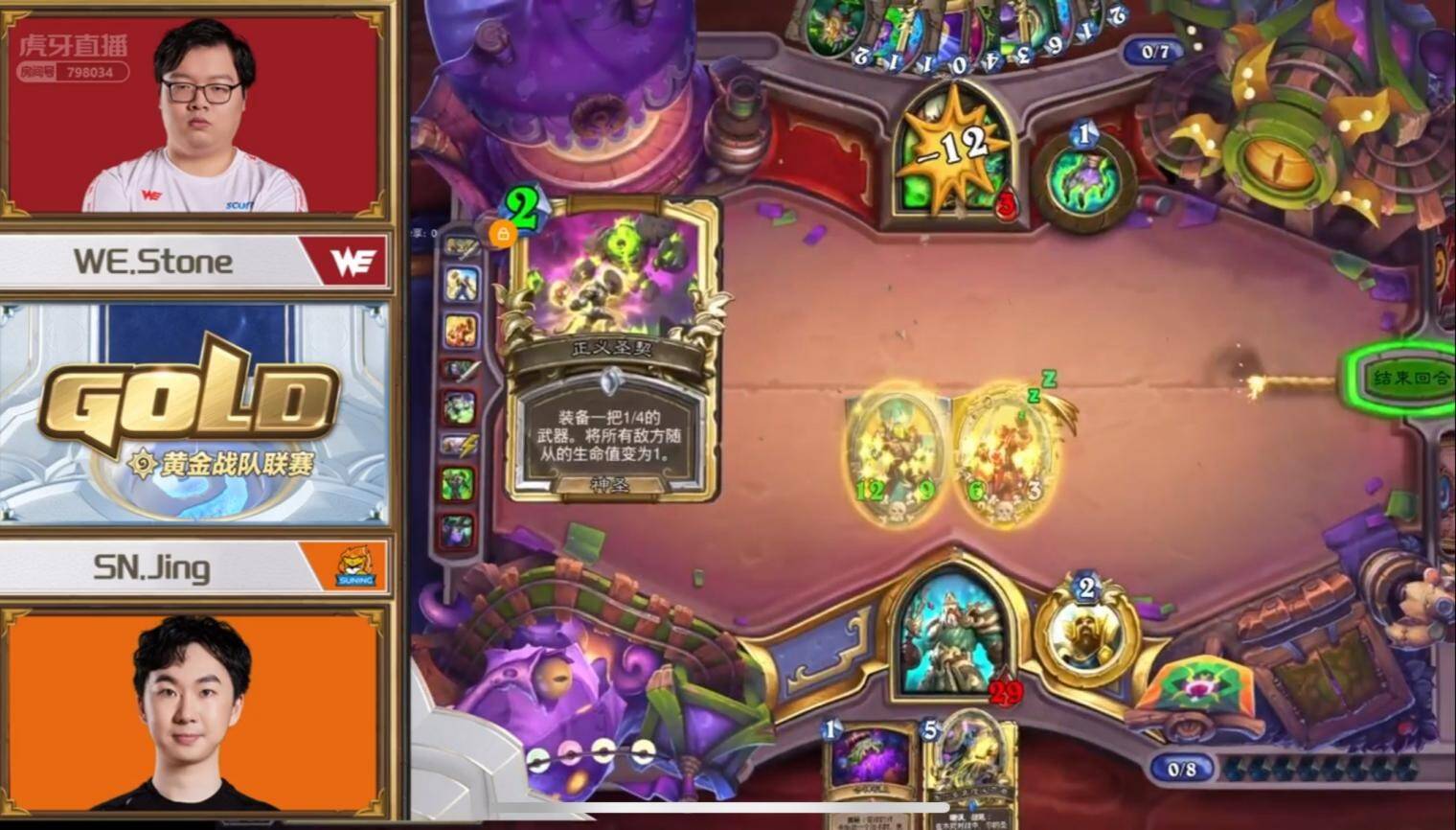 这盘对局是我在上半赛季复盘后唯一一盘因为自己打法上的失误影响比赛总结果的对局(做到更好或许可以给团队追回一分,当然同理有些我们赢下的比分也是靠对手的不完美)。我用圣契骑对阵WE石头的吸血瞎,本回合我当时的心路历程是,由于自己占据了比较大的场面,想选择伤害最大化,因此把正义圣契的一点伤害也交出打到了对手脸上,但对手下回合打出了双莫尔葛工匠点盾吸血的一系列配合,解场站场加回血。由于这套骑士卡组本身非常缺乏解场和返场手段,因此只是贪图上回合一点无意义的伤害,没有保留下来进行下回合的解场,是非常不理智的。所以在关键回合的胜负手上,一定要考虑清楚对手下回合会做什么事,对面可以靠哪种非常规手段赢等等。
