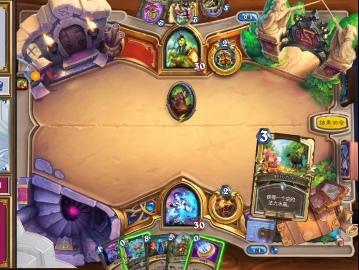 此局也是下半阶段KOF10BAN4赛制下对阵WE元素(一哥)的一盘对局,当前画面下的猎人也面临着几种树状交叉的不同选择,而抉择的不同也同样直接决定了比赛结果。这局同样是德鲁伊在前期过牌补充手牌量并在四费的时候铺满场面,而不同的是猎人并没有在前期制造出很大的场面给到德鲁伊很足的场面及伤害压力。