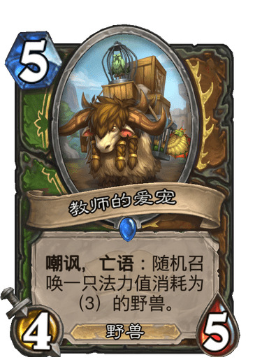 教师的爱宠,本身嘲讽属性对阵节奏卡组比较好用,而且现在掉出的3费野兽整体质量也非常高,例如:中立随从穆克拉、圣盾剧毒蛇皮蜥蜴、剧毒蝎、丛林猎豹、雷象,盗贼的随从水栖蝮蛇(空场剧毒),猎人的随从熊鲨、强能箭猪、顶级捕食者兹克索尔(终极随从)、饱腹巨蟒,德鲁伊的随从牙腹德鲁伊(43嘲讽亡语给手牌中的一个野兽减两费),伊利丹随从邪能响尾蛇,其实除了猫头鹰以外其他的3费野兽都是不错的,因此要满编。