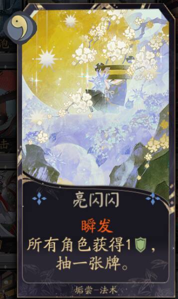 亮闪闪:叠加天井下灵力的好牌,起手除非其他牌特别优秀要不然通常情况我们都会留下亮闪闪,配合欢愉之音使用叠2甲是抗快不错的手段或配合快去洗澡必杀对面关键式神使用。总体来说亮闪闪效果和瞬发抽牌都非常不错,是我们起手拿到大概率留下来的牌。
