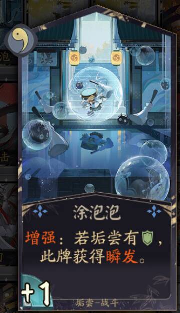 涂泡泡:垢尝增加攻击频率的牌,其实非常普通但是为了给大家讲一个技巧所以单拿出来说技巧就是:在前中期我们没办法击杀对面需要靠手中的觉醒天井下时我们可以不要着急打出涂泡泡,等打觉醒天井下和灵力的时候瞬发使用涂泡泡弥补我们觉醒当回合的空场,同理铃鹿御前的白刃也一样。