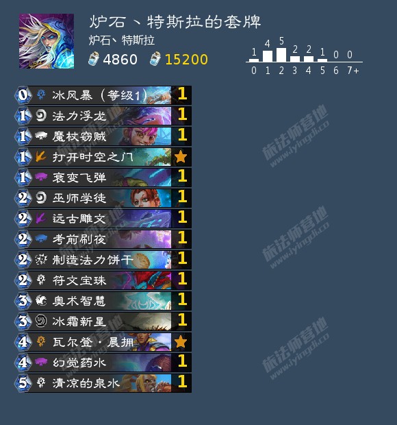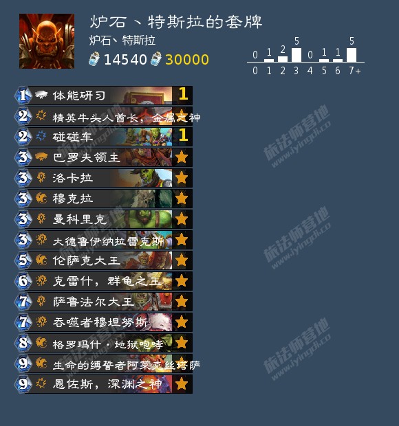 点评:卡组前期比较弱,成型之后在对阵法系职业或打脸职业大优,对阵洪流卡开门法也有一战之力,后期100多点的克战需要法师最少开4门才能杀,而法师正常需要9费才能开4门。
