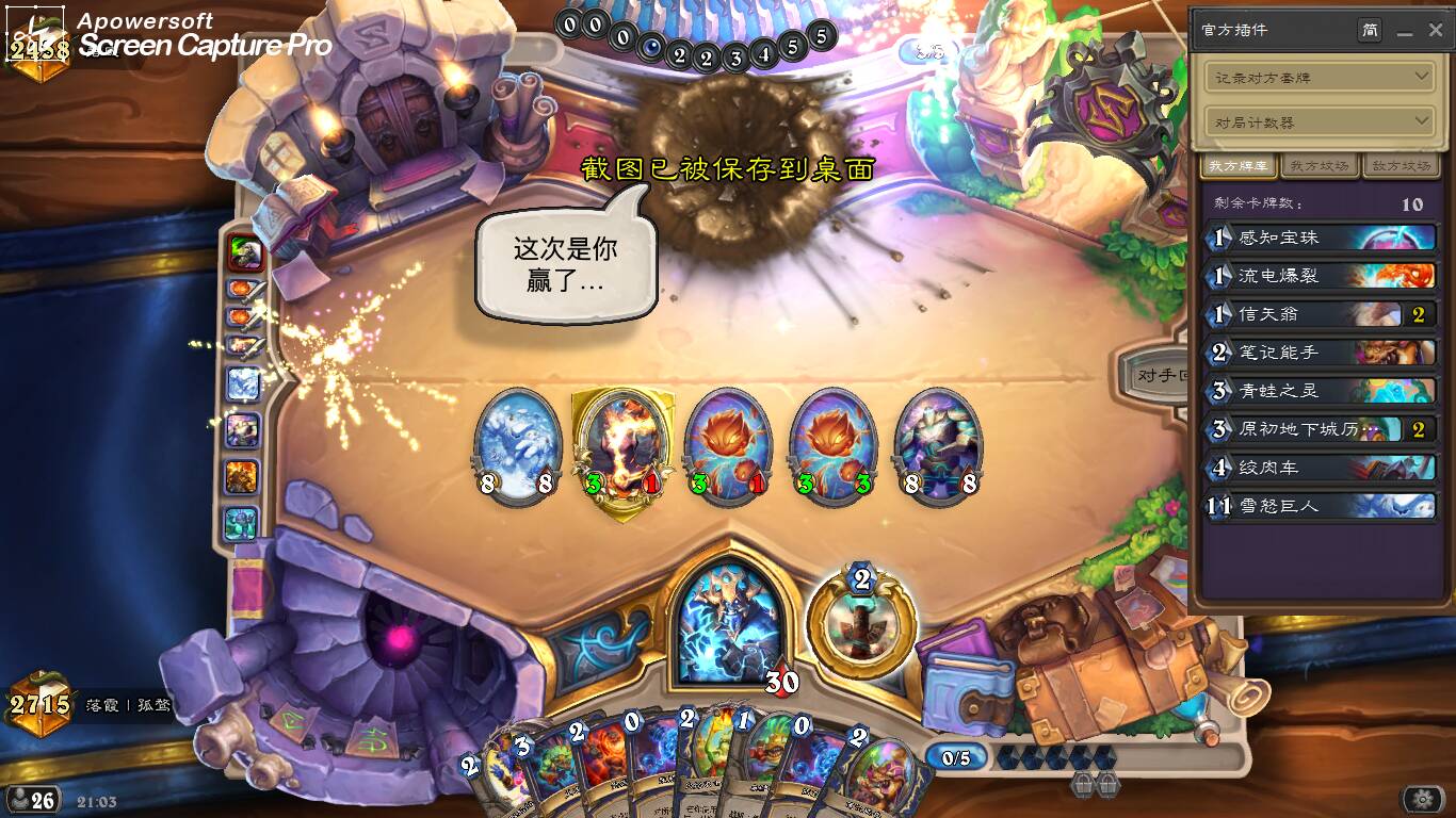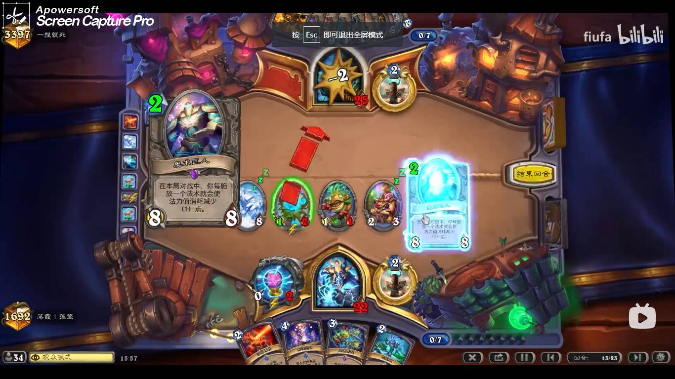 [ 这里简单提及一下背景,此时牌库里还有2个1费(不稳定的异变和永火),3个2费(2个先祖和一个震击),2个3费。在绞肉车打出之前只用过冰钓术一个法术。]