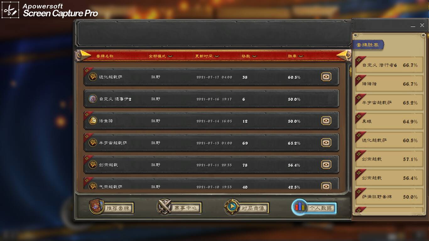 各位老哥们好,这里是落霞|孤鹜。今天给各位带来的是全新卡组进化超载萨的攻略,外加超载萨交流群的诸位测试出的3套思路成熟的卡组。本月笔者从传说7000名开打,期间接连测试了全部4套卡组总计200余把,最终以较高胜率打到了传说649名,战绩如下。