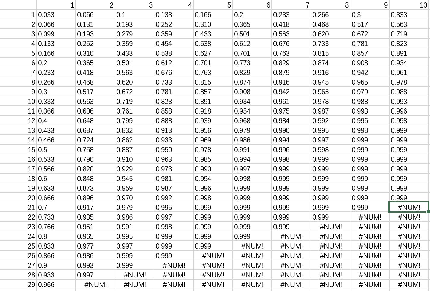 先解释一下图中数字所代表的意思:x轴的数字代表我们所携带的key牌数量,y轴的数字则是抽牌数。表格内的数据代表至少抽到1张key牌的概率。