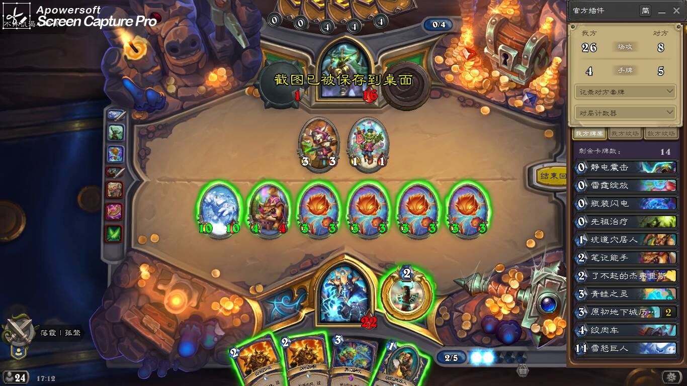 这里就要牵扯到赢点的问题了,在对阵黑眼术等铺场卡组时,只要凑齐火毒回响一套就可以稳定拿下,这时2费法术只需要过到冰钓术和熔岩振击即可,然后打出熔岩振击检索灵魂回响。接下来请控制手牌数量在8+n张。这里的n指火毒,以及我们下回合可以打出的手牌。例如笔者手里有一张火焰术士,就可以留到9张牌,这样下回合哪怕抽了一张,手牌满了,使用冰钓术也不会爆掉鱼人导致失败。