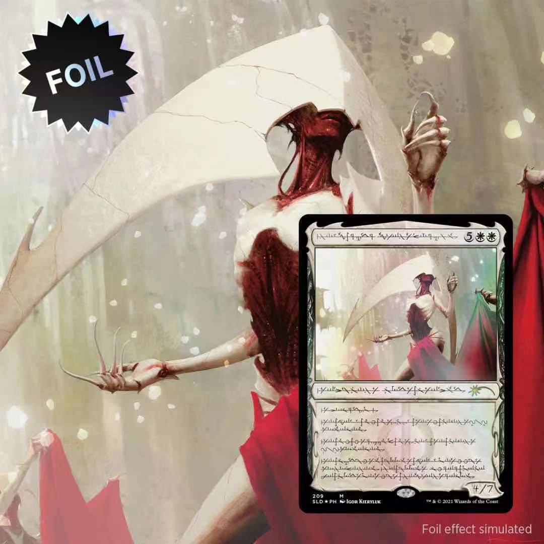 这次珍品所选择的五位魔判官各自掌控一种颜色,是非瑞克西亚入侵秘罗地的急先锋。篇幅所限我只介绍我个人最喜欢的一位——大修道士艾蕾侬,艾蕾侬代表着白色法术力区块,她将其坚信的”真实“灌输给每个人:即使把每个人撕成碎片再重新缝合也无愧于非瑞克西亚。值得纪念的是,艾蕾侬这张牌正是威世智官方发布的第一张新非瑞克西亚文字卡牌,当初以裁判闪的方式登场,向世界宣告了新非瑞克西亚文字的诞生,如此牛B的登场方式加上本身就及其强悍的能力效果,令其卡牌的价格一路水涨船高。其他几位魔判官也都不遑多让,毕竟能在这种残酷的竞争下登顶的没一个不是狠角色。