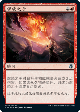 燃烧之手让红色套牌的备牌更强了,可以2费单卡解掉年长庞巨兽、寰宇盘蛇寇玛、热恋野兽和寻水兽等等不好去除的生物,也能处理掉在生物防线后的护兽薇薇安了。