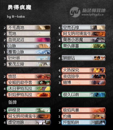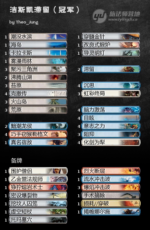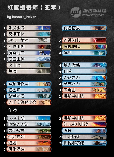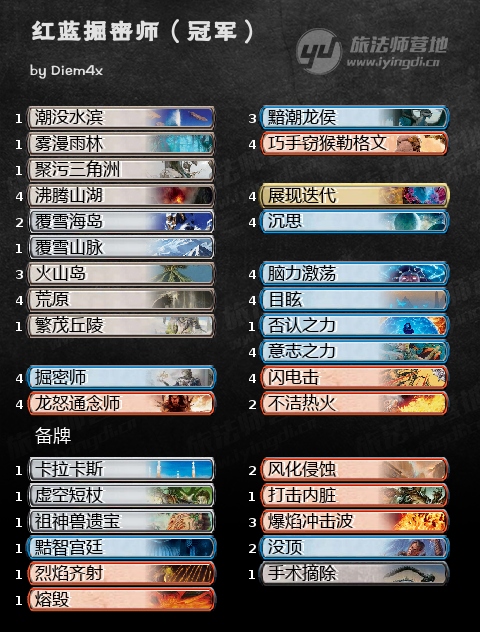 我认为红蓝掘密师的构组已经完全固定,正如这里的冠军牌表。不洁热火成为了套牌的重要组成部分,是非常强大的去除手段。我也很喜欢备牌的黠智宫廷,在长盘对局表现出色