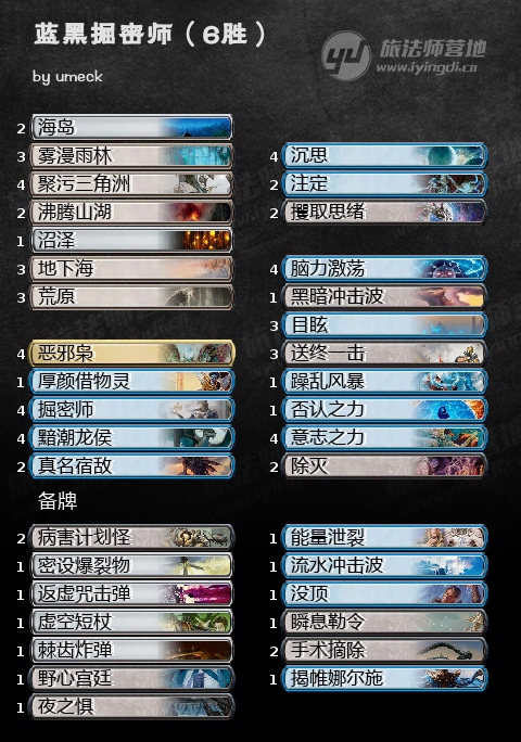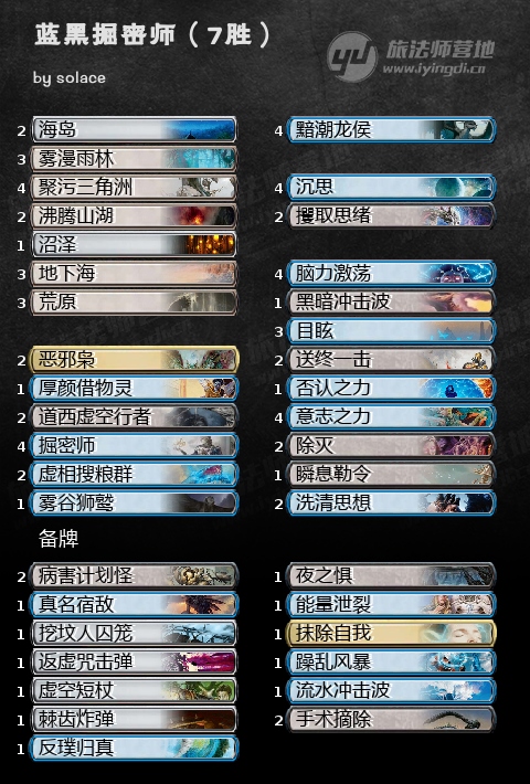 亚军的红蓝掘密师是没有使用龙怒通念师的版本。很久没有看到掘密师使用真名宿敌了,我认为这张牌在当前环境里可能并没有较好的地位,不过仍适用于许多对局,尤其是当前虹彩终局的用量有些大