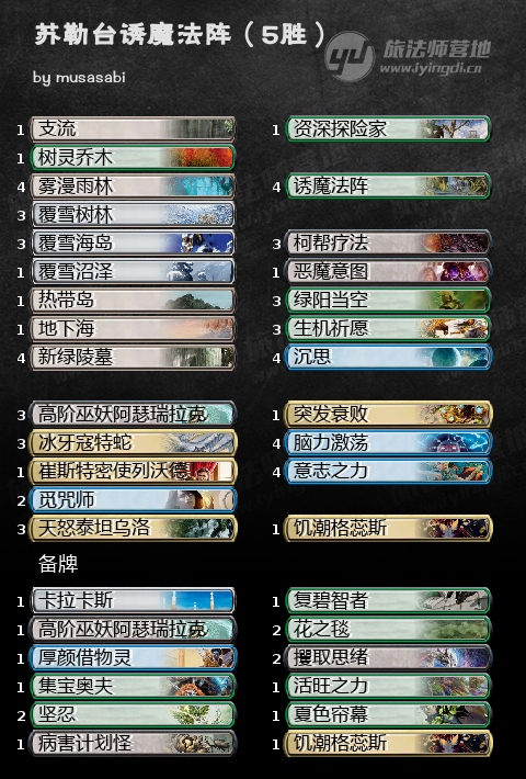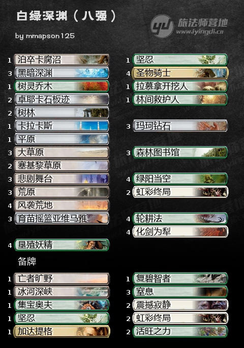 八强还有一套白绿深渊。使用了3育苗摇篮亚维马雅,巩固了法术力基础,这绝对是很棒的补强。另外主1备1的坚忍也很不错,这套牌能很好地利用起该生物